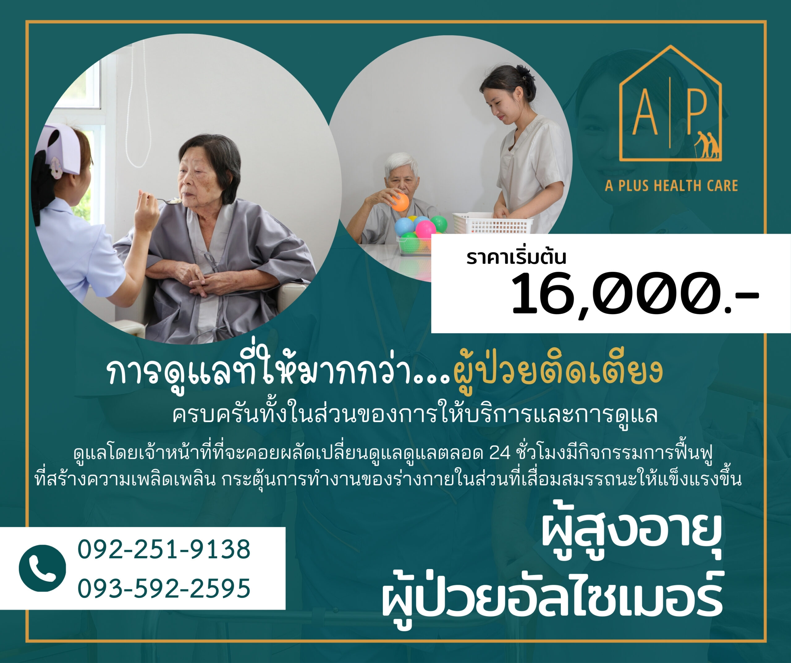 APlus Health Care เป็นศูนย์ดูแลผู้สูงอายุ นนทบุรี กรุงเทพและปริมณฑล รับดูแลฟื้นฟูผู้ที่ช่วยเหลือตัวเองได้และไม่ได้ ให้บริการดูแลผู้สูงอายุ คนชรา และผู้ป่วย เช่น ผู้ป่วยเจาะคอ ดูดเสมหะ มีแผลกดทับ ผู้ป่วยที่ให้อาหารทางสาย ดูแลผู้ป่วยที่อยู่ในระยะพักฟื้น ทั้งด้านโภชนาการ กิจวัตรประจำวันทั่วไป สุขอนามัย ทำกายภาพบำบัดตามความสามารถของผู้สูงอายุและผู้ป่วย ฝึกการนั่งและทรงตัว เพื่อส่งเสริมให้สามารถกลับมาใช้ชีวิตได้ตามปกติ